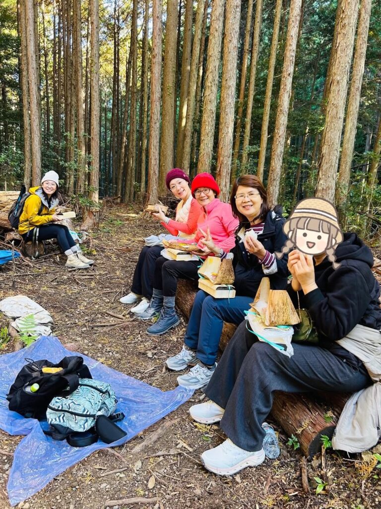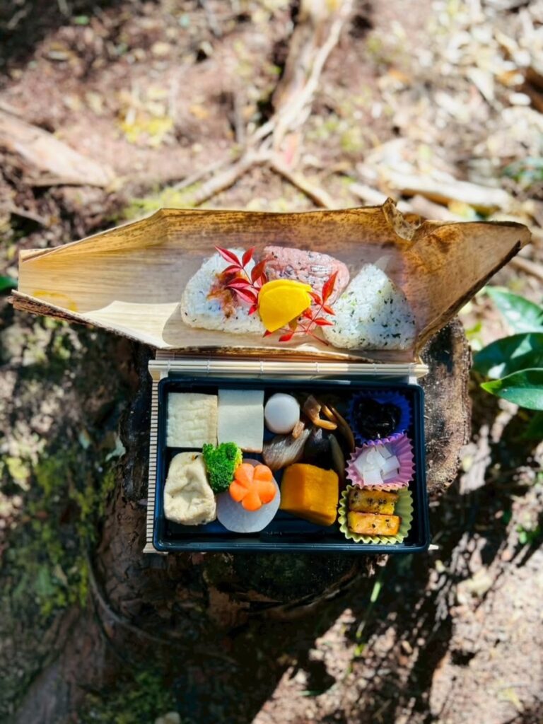 お昼時、私たちは古道の森の奥深に本格的な精進料理のお弁当を広げました。隅々まで心が込められた日本の美意識が感じられ、食べるのがもったいないほど。旅人たちは「世界遺産の中でピクニックができるなんて、本当に最高で、なかなかできない体験!」と感動していました。まるで大自然の懐に抱かれ、山と森の息吹と一つになったかのようです。