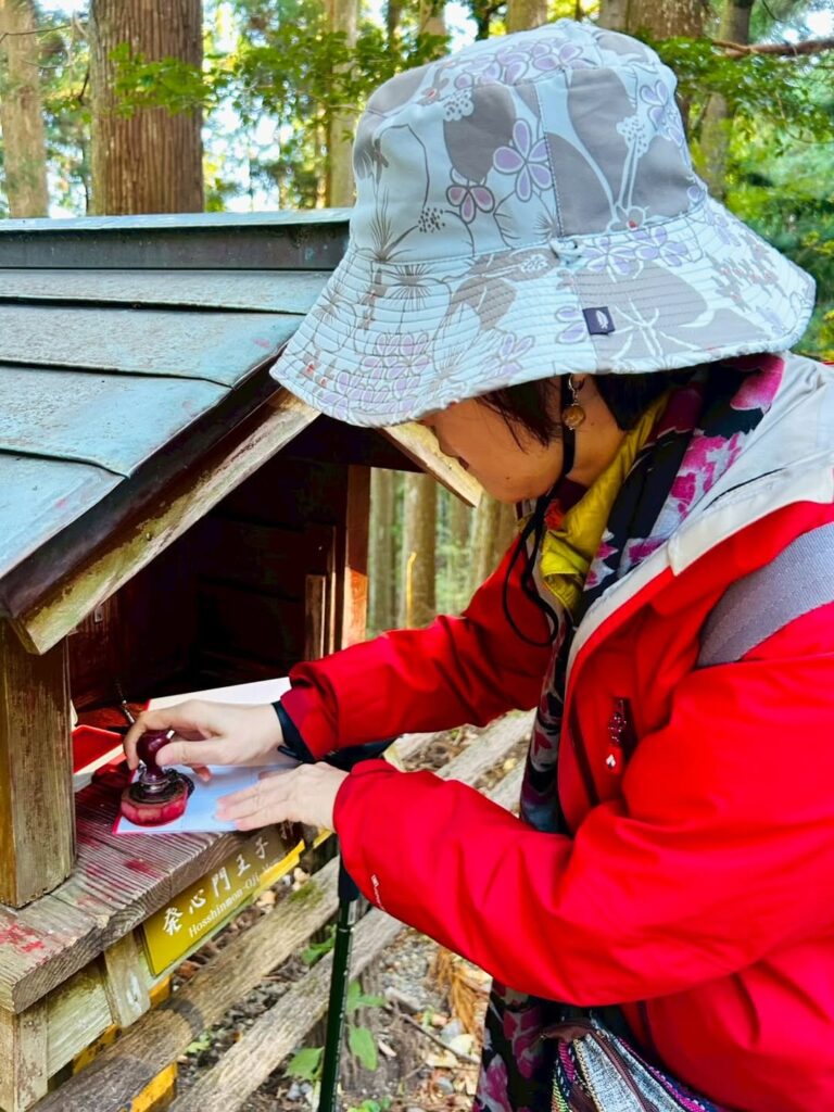 途中、皆さんは笑い合いながら歩き、足元の石段や曲がり角を互いに声を掛け合って確認していました。最初は完歩に自信がなかった旅人も、最後には自分の頑張りを誇らしく思い、満面の笑顔に。旅の中でいちばん微笑ましかったのは、みんなが真剣な表情で「スタンプ集めに夢中になっている姿でした。巡礼認定証〈日本編〉も無事にGET! いつか皆さんから、スペインのサンティアゴ巡礼の道のお話を聞ける日を楽しみにしています。